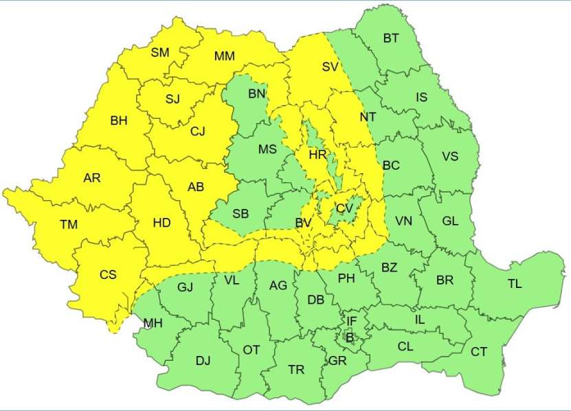 Atenționarea este valabilă până mâine dimineață la ora 06:00, urmând ca situația să fie reevaluată în funcție de evoluția fenomenelor.