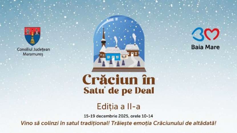 Consiliul Județean Maramureș și Primăria Municipiului Baia Mare anunță cea de-a doua ediție a evenimentului „Crăciun în Satu' de pe Deal”, care va avea loc în perioada 15–19 decembrie 2025 în incinta Muzeului Satului din Baia Mare.