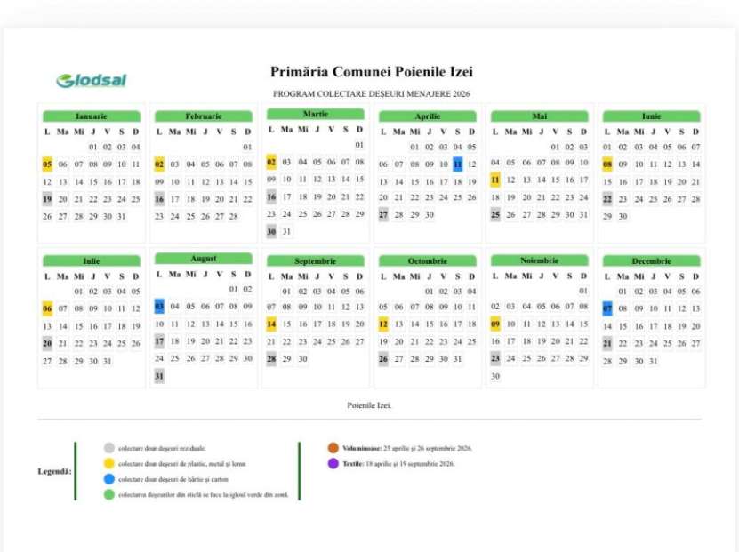 Primăria Comunei Poienile Izei, în colaborare cu operatorul Glodsal, a făcut public programul de colectare selectivă a deșeurilor menajere pentru anul 2026. Calendarul detaliat, care acoperă toate tipurile de deșeuri reciclabile și reziduale, este disponibil acum pentru cetățeni.