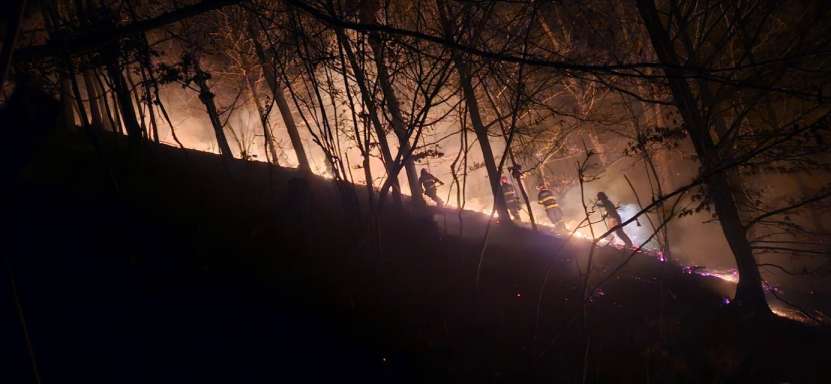 Cel mai dificil și extins incendiu a izbucnit vineri seară pe raza localității Nănești. Aici, focul s-a propagat rapid pe o suprafață estimată la aproximativ 50 de hectare de pădure, într-o zonă abruptă și inaccesibilă autospecialelor de intervenție.